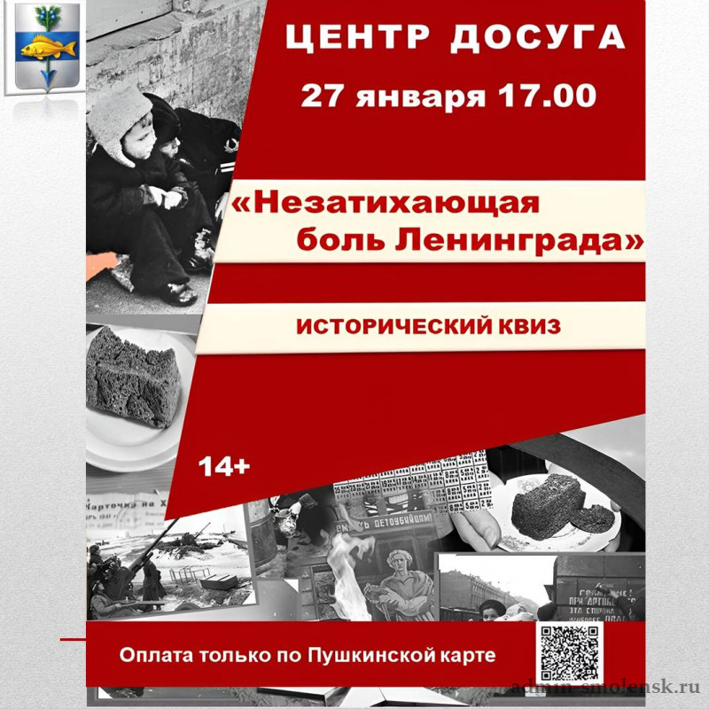 27 января в 17:00 Центр досуга приглашает владельцев Пушкинской карты на исторический квиз, посвящённый подвигу блокадного Ленинграда