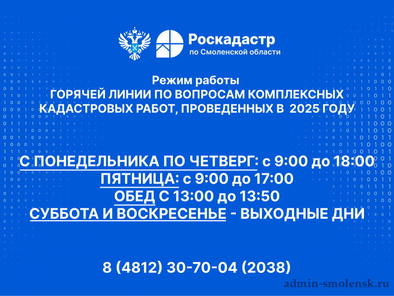 С целью оказания информационной поддержки и помощи в вопросах, связанных с комплексными кадастровыми работами (ККР), проведенными в 2025 году, филиал ППК «Роскадастр» по Смоленской области открывает специализированную «горячую» линию