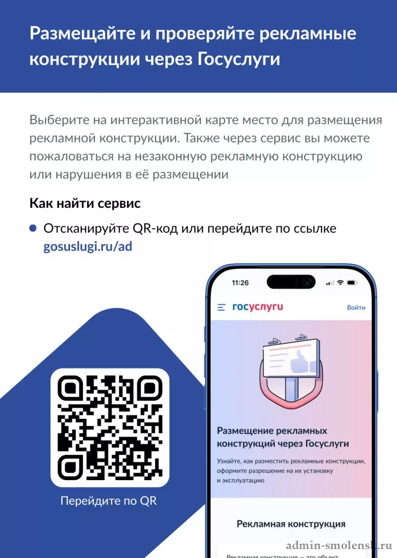 На «Госуслугах» для жителей и бизнеса Ершичского муниципального округа запущен комплекс новых сервисов в сфере наружной рекламы. В цифровой формат переведены ключевые процессы: от поиска места для рекламной конструкции до согласования социальной рекламы.