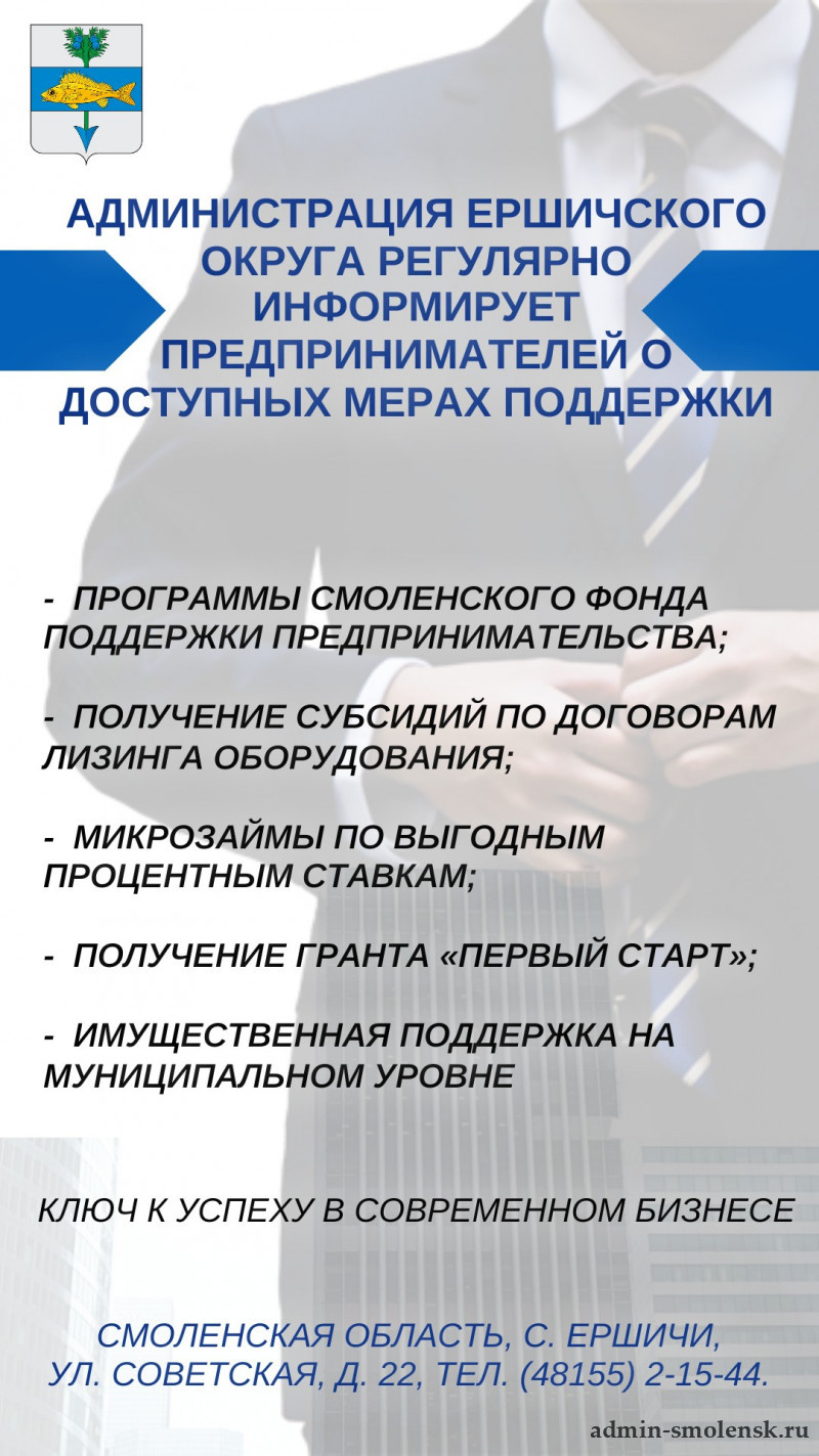 Информацию по мерам поддержки можно получить, обратившись в отдел экономики, управления муниципальным имуществом и сельского хозяйства Администрации муниципального образования «Ершичский муниципальный округ» Смоленской области, расположенном по адресу: Смоленская область, с. Ершичи, ул. Советская, д. 22, тел. (48155) 2-15-44.